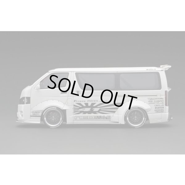 T・S・D WORKSのハイエースワイドボディを1/18スケールレジンモデルで再現。T・S・D X-Three 19インチホイール(ポリッシュ&ガンメタリック)にローダウン仕様。T・S・D 製フルエアロパーツ(フロントアンダースポイラー、サイドステップ、リヤスポイラー、リヤウィング)、各所に専用デカール、4本出しマフラー、バケットシート(ブラック)、内装にロールバー(ブラック)を装着。