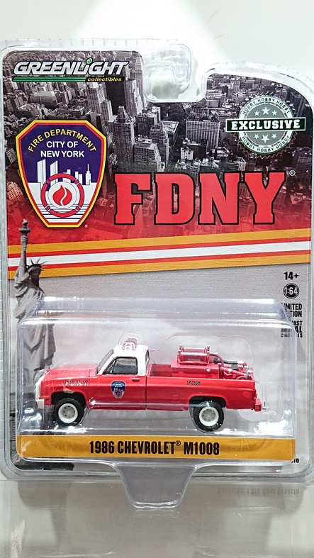 GREEN LiGHT EXCLUSIVE 1/64 1986 Chevrolet M1008 4x4 - FDNY with Fire Equipment, Hose and Tank