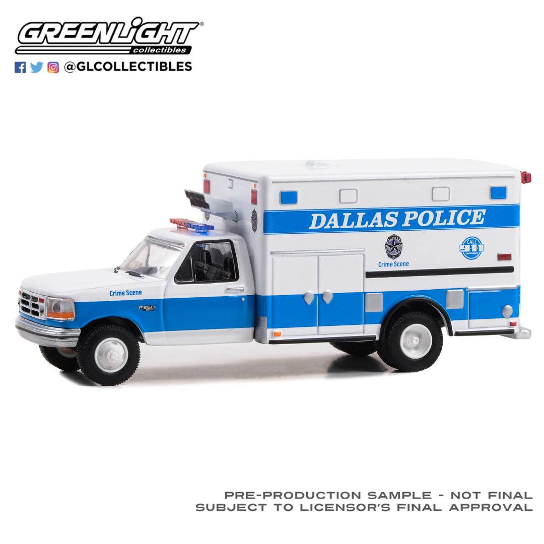 GREEN LiGHT EXCLUSIVE 1/64 First Responders - 1992 Ford F-350 Ambulance - Dallas Police Crime Scene, Dallas Texas