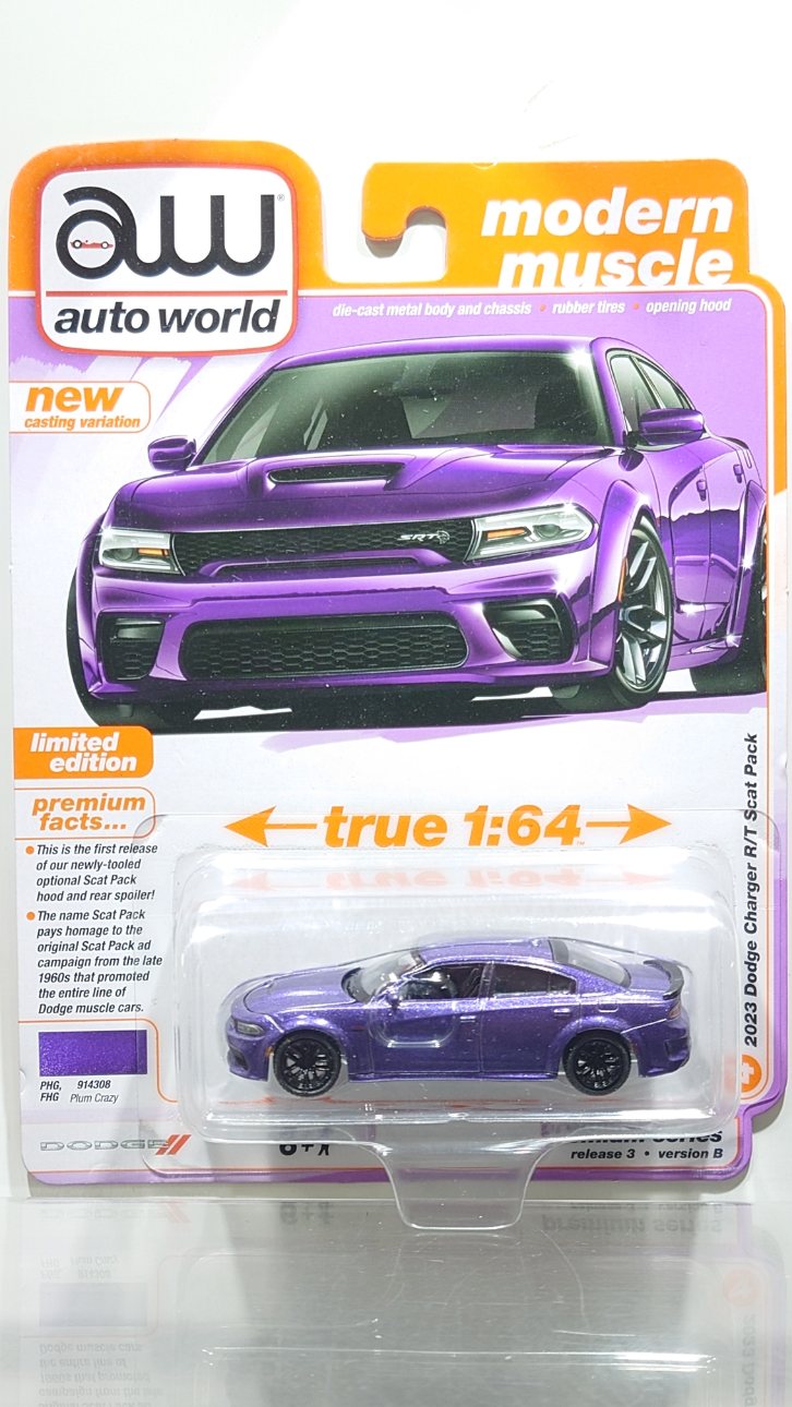 auto world 1/64 2023 Dodge Charger Swinger R/T Scat Pack Plum Crazy