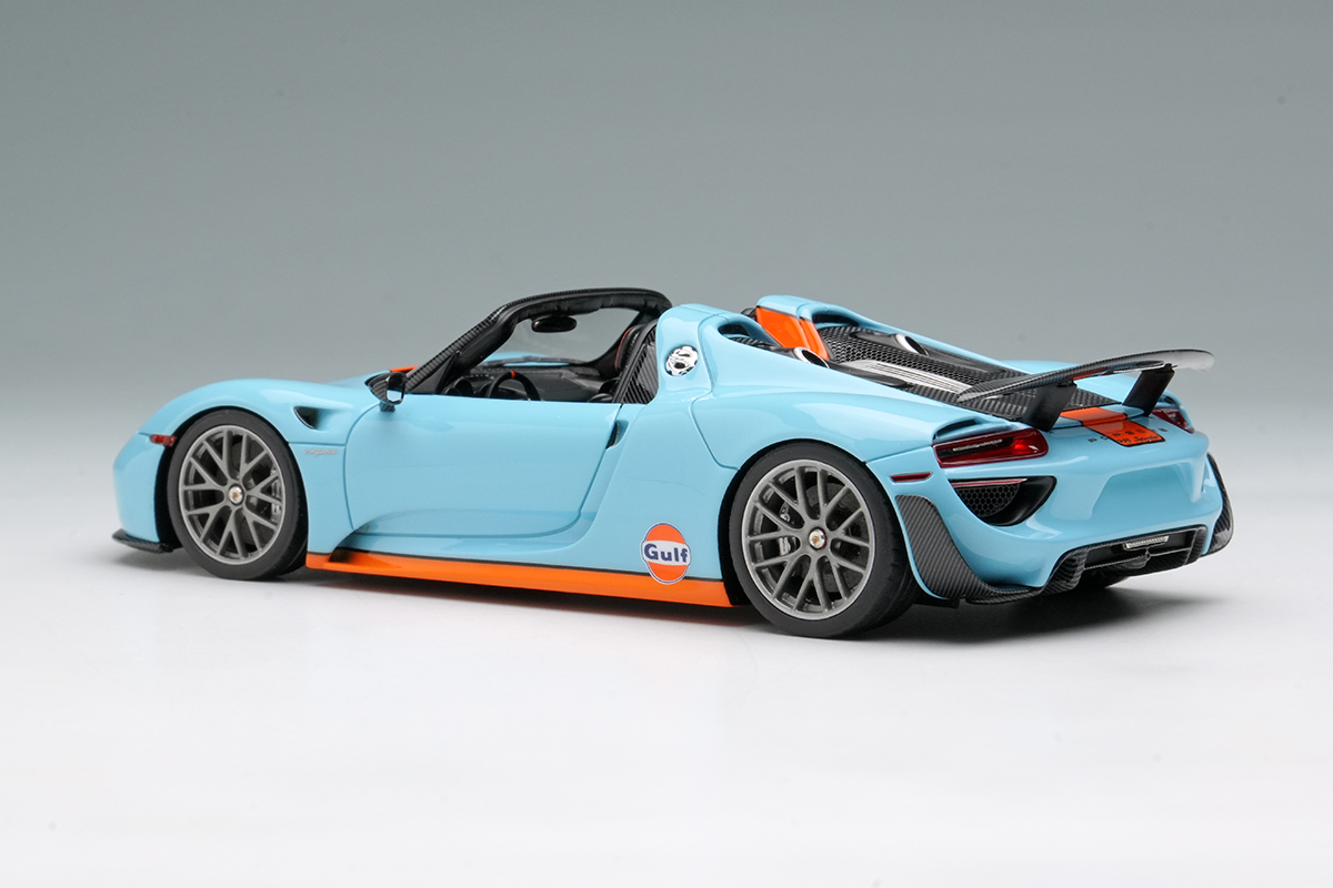 EIDOLON COLLECTION 1/43 Scale Porsche 918 Spyder Weissach Package 2011 Rear Wing Up Gulf Blue / Orange Stripes (US Spec) Limited 120 pcs.