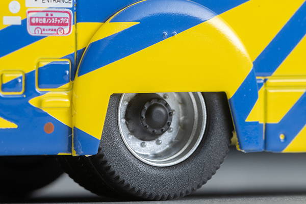 本製品では東大阪市にある枚岡営業所のいすゞエルガをプロトタイプとし、実車の表記類やステッカーを再現。独特な形状のタイヤカバーも新規パーツで再現しています。発売中のジオコレ64 #カースナップ バス停と組み合わせても楽しさが広がります。