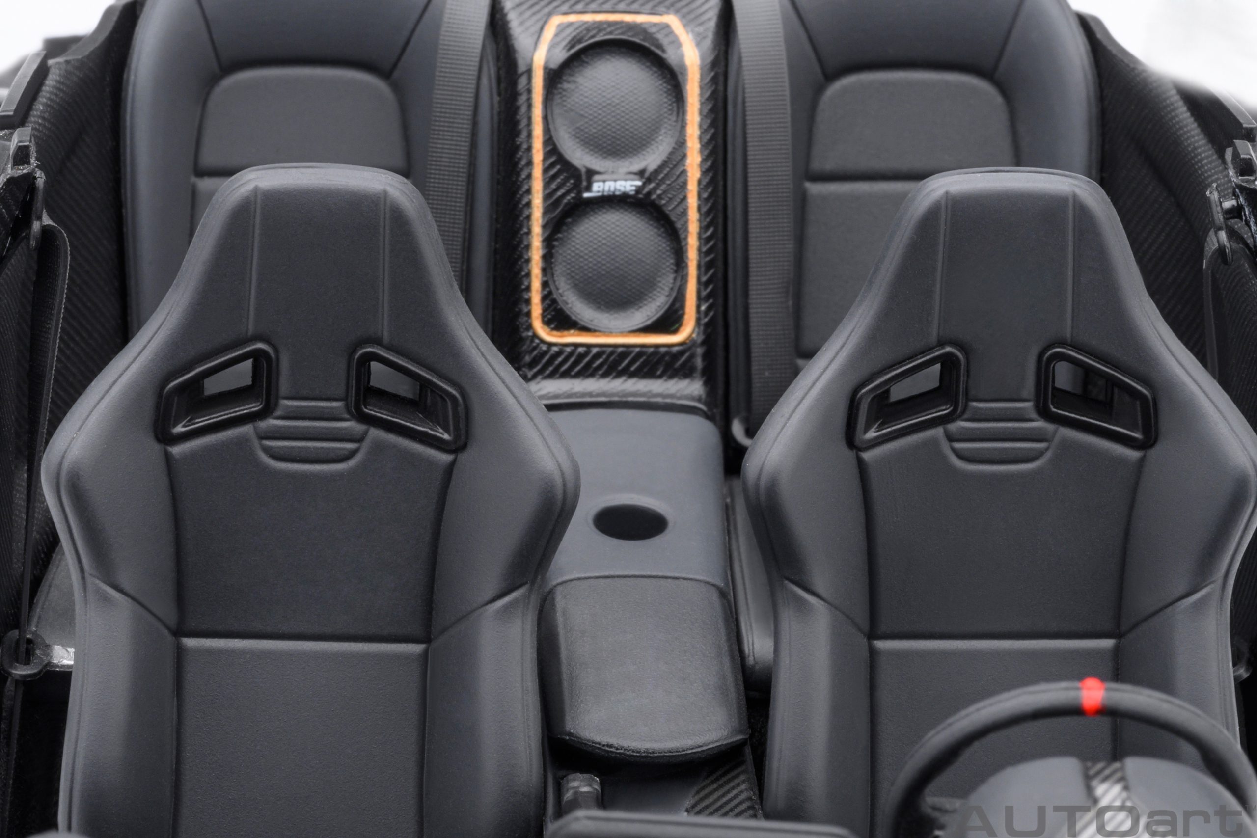 2018年6月に発表された『NISSAN GT-R50 by イタルデザイン』は、スカイライン時代から数えた「GT-R」の誕生50周年とイタルデザインの創業50周年とを記念し、日産自動車とイタルデザインによって共同開発された世界で50台の限定モデルです。市販の「NISSAN GT-R NISMO」をベースに、大幅に変更されたより低く幅広いボディデザインは、日産のデザインスタジオが担当。搭載される3.8リッターV6ツインターボエンジンは、GT3仕様の大口径ターボチャージャーや大型インタークーラーを採用し、吸排気系などにも改良を加え、最高出力はノーマルの600psから720psにまでパワーアップされています。日本からイタリアに運ばれた「GT-R」をイタルデザインの職人が手作業で分解し、新たなパーツと併せ再度組み上げるという手の込んだ特殊生産手法が採られています。オートアートでは、販売価格1億円を超えるこの記念すべき「GT-R」をリアルにモデル化。写真撮影とデジタルデータを用い、滑らかで特徴的なスタイルをはじめ、浮かび上がるようなリング型テールライト、専用デザインの21インチホイール&ミシュランタイヤなど細部まで拘って再現しました。ボンネットは取り外し式、大型リアウィングはボディ裏面のスイッチで上下に可動、ロゴ入り専用トランクも付属します。