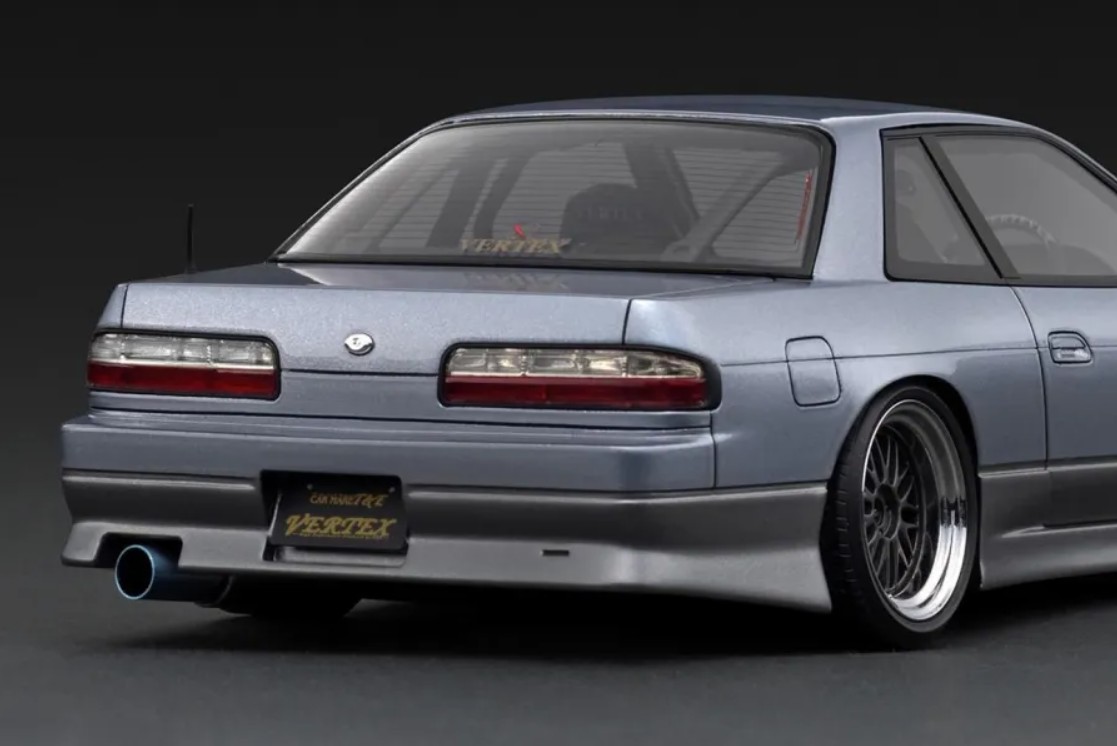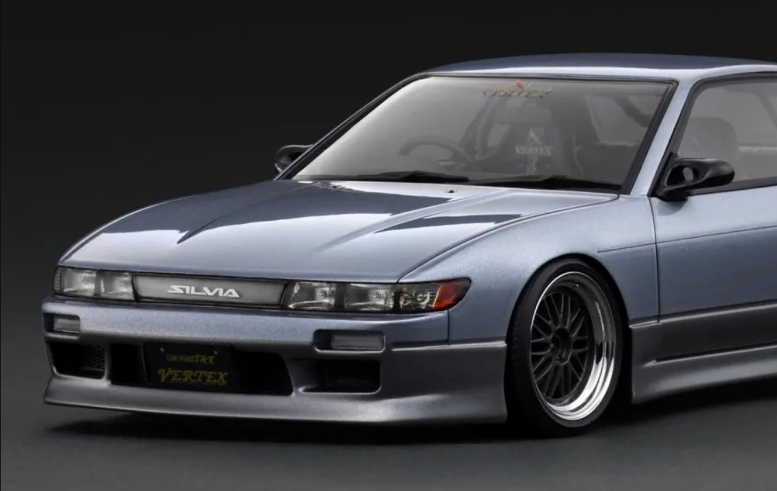 「VERTEX S13 Silvia 」を1/18スケールレジンモデルで再現。BBS LMタイプ 17ンチ(ポリッシュ&ガンメタリック)にローダウン仕様。VERTEX製エアロパーツ(フロントバンパー、サイドステップ、リヤバンパー)を装着。フロントウィンドウ上部とリヤウィンドウ下部に「VERTEX」ロゴ、大径シングルマフラー(チタンカラー)、VERETX製品バケットシート、VERTEX製ステアリングを装着。
