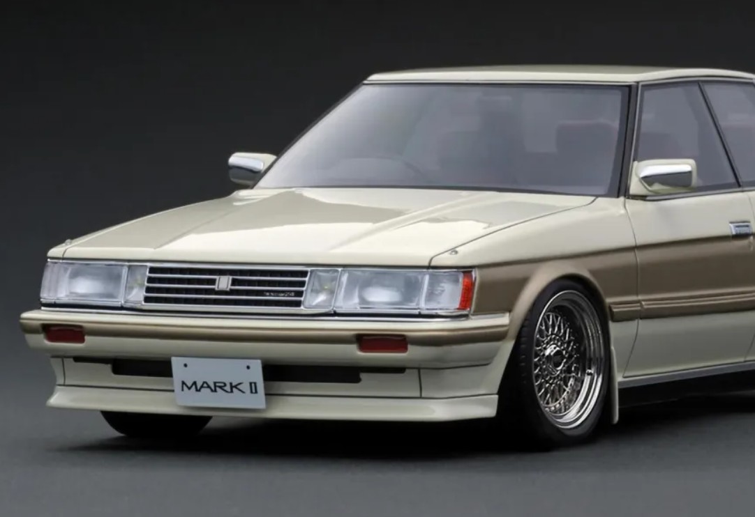 「MarkIIGrande (GX71) 」を1/18スケールレジンモデルで再現。内装色:ベージュ。BBS RSタイプ17インチホイール(ポリッシュ&シルバー)にローダウン仕様。純正リップスポイラー、デュアルマフラー、ナルディタイプウッドステアリング、TS-X10スピーカーを装着。