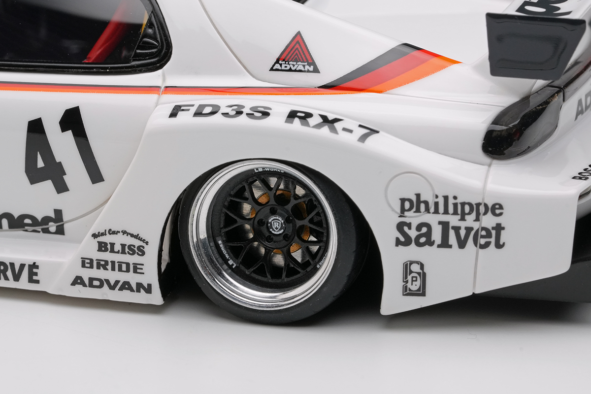 ドライビングランプを備えたロングノーズバンパー、シルエットフォーミュラーを彷彿とさせるオーバーフェンダーとリアバンパーなど絶妙なバランスで成形されており、RX-7のロータリー特有の低重心・流線型シルエットを損なわずに迫力だけを増しています。