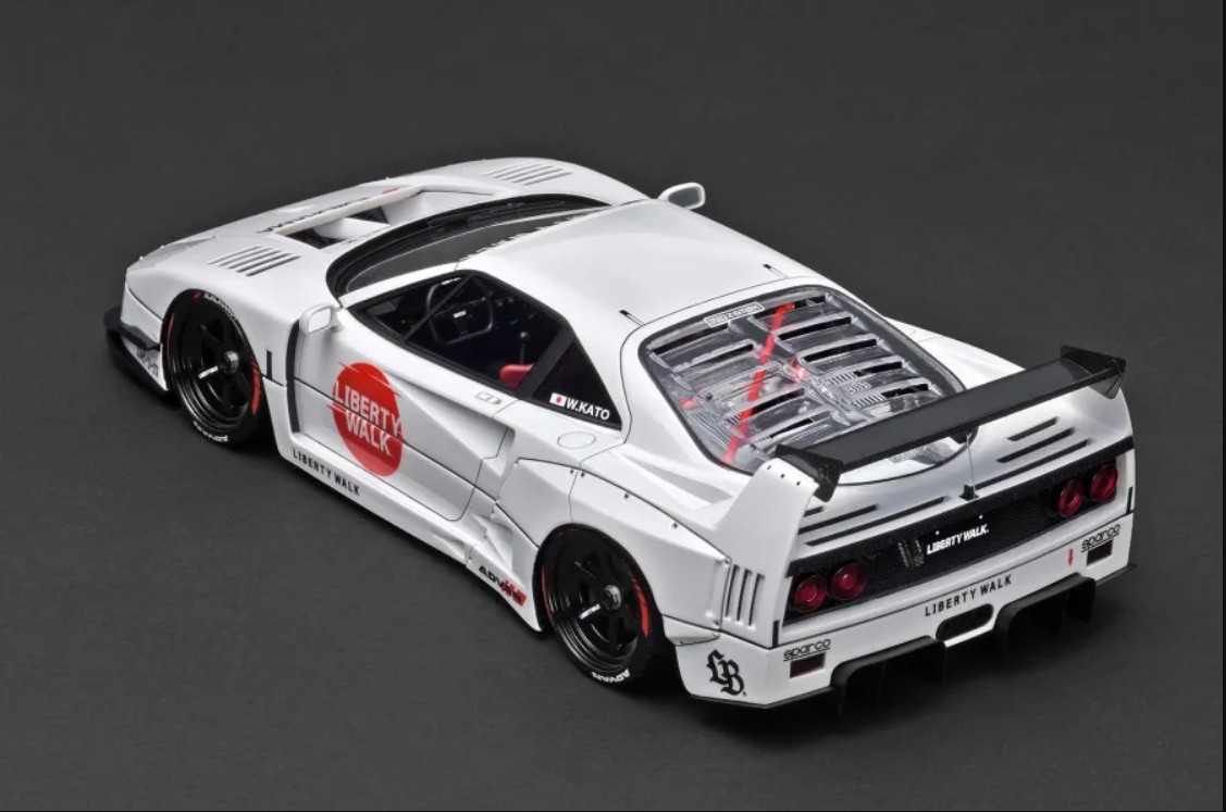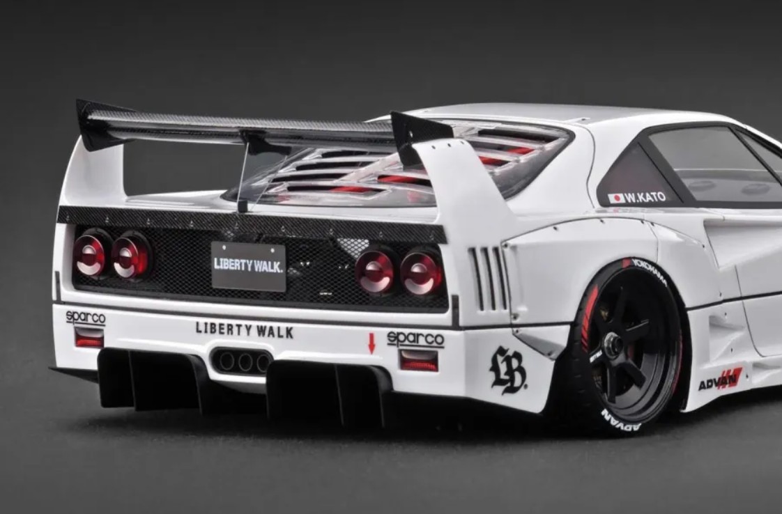 リバティウォークのデモカー「LB-WORKS 40」を1/18スケール レジンモデル素材でモデル化しました。2023年の東京オートサロンで発表され話題をさらった同車両ですが、今回、最新のカラーリングを纏ったアップデート仕様を3Dスキャニング取材し、内外装の細部を忠実に再現しました。LB-worksオリジナル6本スポーク18インチホイール(ブラック)に専用ボディキット(フロントリップスポイラー、フロントカウル、リヤワイドフェンダー、リヤウィング、リヤディフュ—ザー、カナード)、ボディの各所に専用デカール、内装に専用バケットシート、LB-worksオリジナルステアリング、レッドのロールバーを装着。リヤハッチの内部に収まるV8ツインターボエンジンはクリヤーカバーのルーバー超しに眺めて楽しんでいただけるよう、詳細に再現しました。