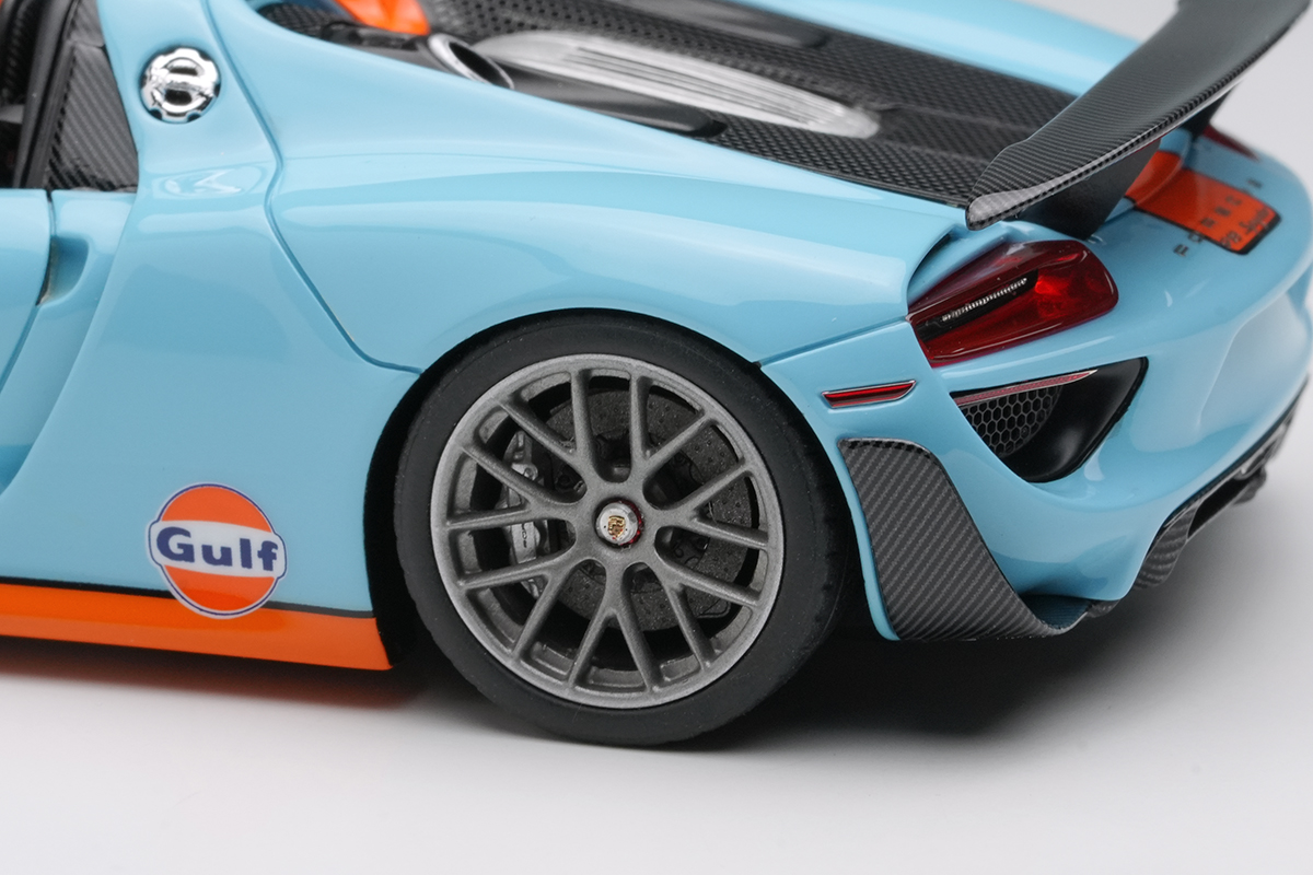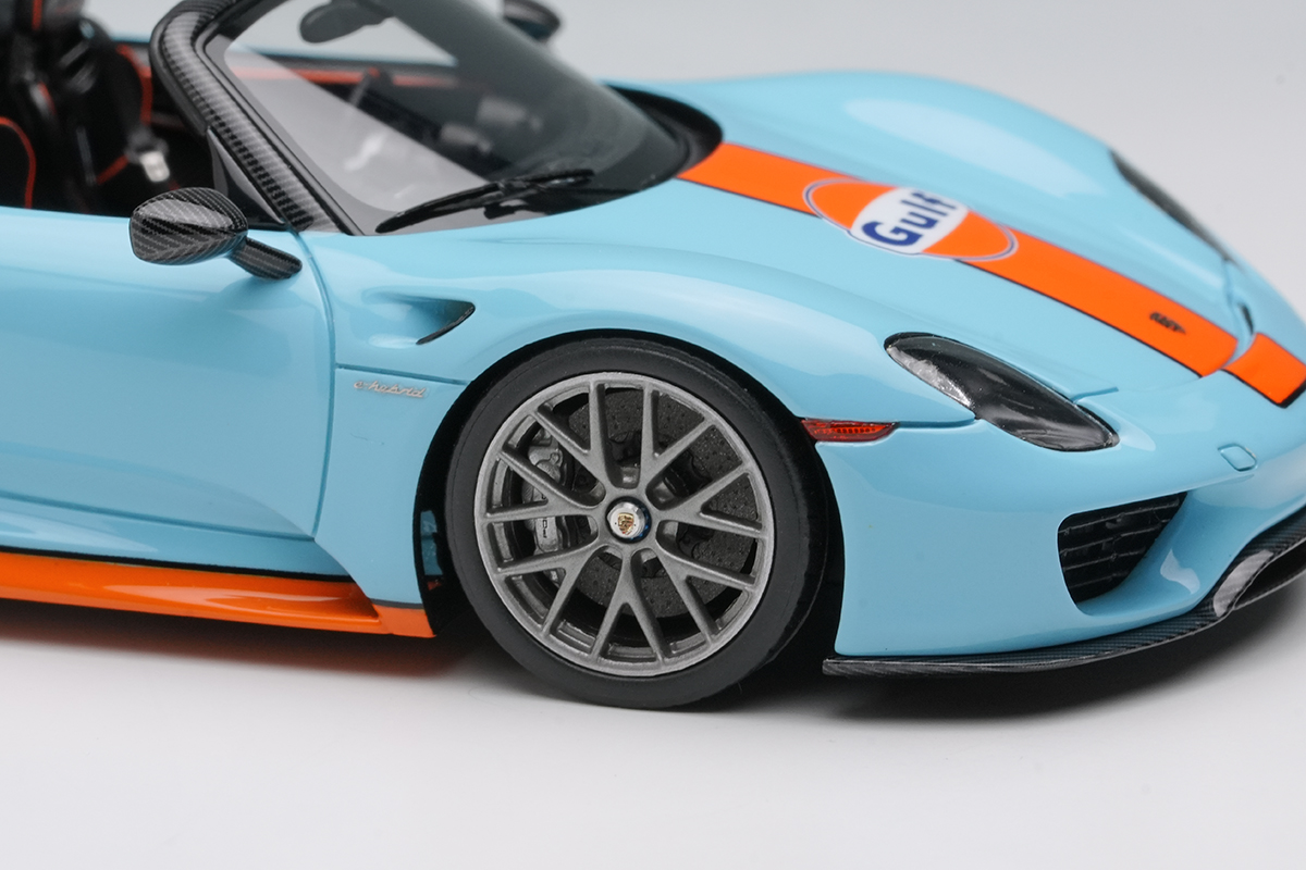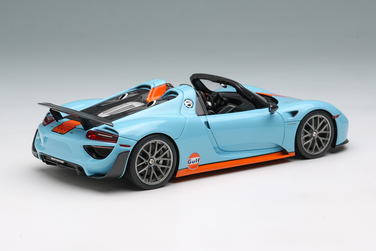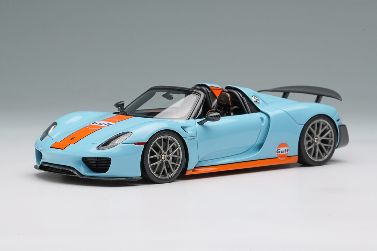 EIDOLON COLLECTION 1/43 Scale Porsche 918 Spyder Weissach Package 2011 Rear Wing Up Gulf Blue / Orange Stripes (US Spec) Limited 120 pcs.