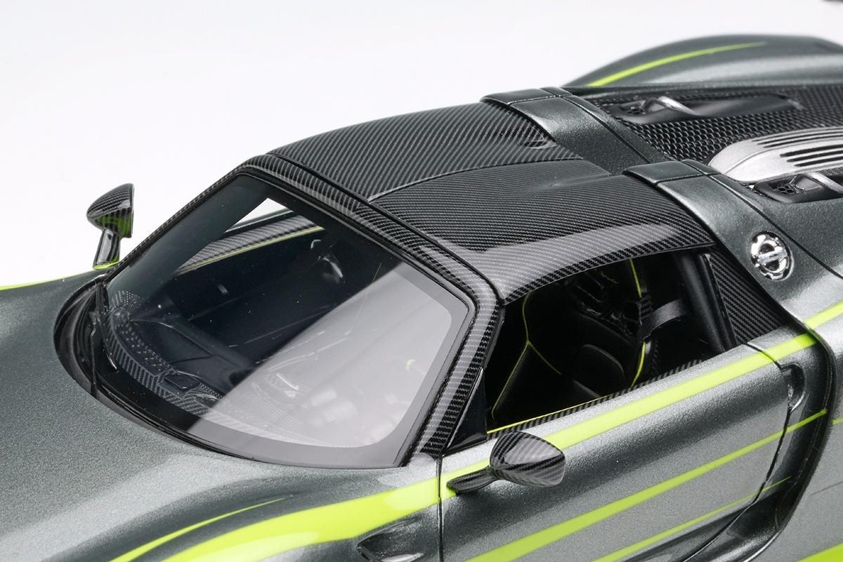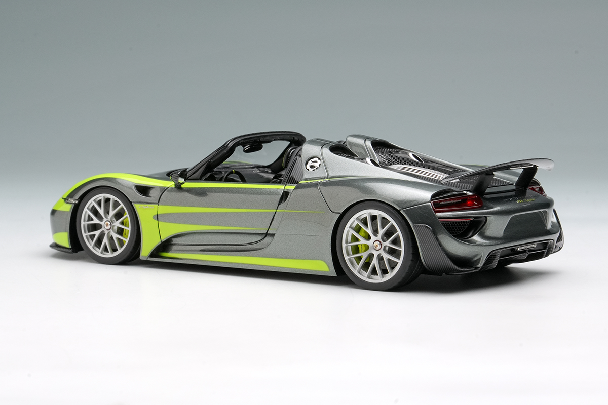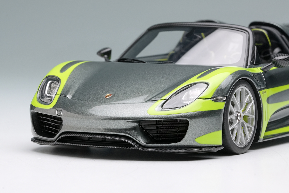 EIDOLON COLLECTION 1/43 Scale Porsche 918 Spyder Weissach Package 2011 Rear Wing Up Meteor Gray Metallic / Acid Green Stripe Limited Edition 80 pcs. [EM812C]