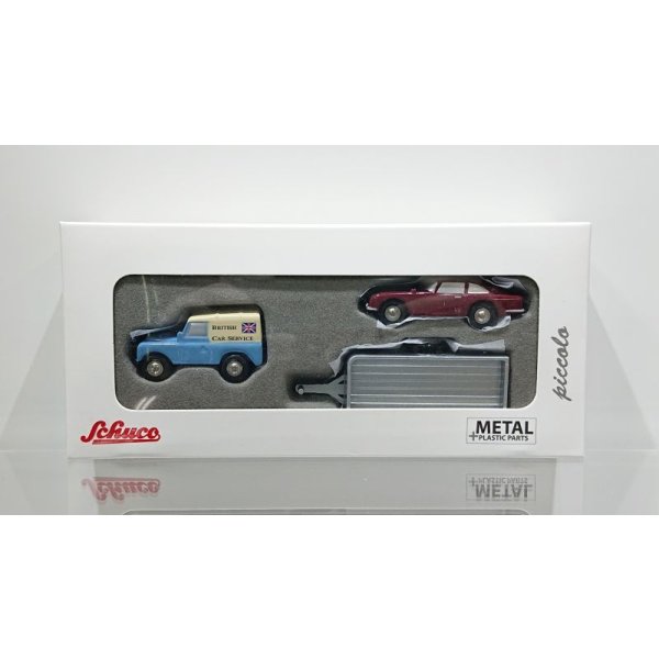 Schuco piccolo Land Rover Series III with car-trailer and Aston Martin DB5 "British Car Service"