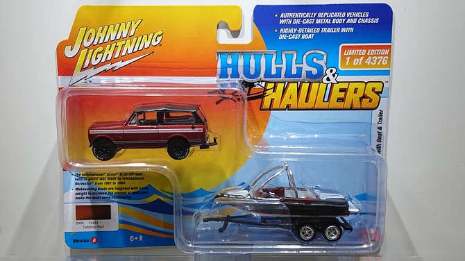 JOHNNY LIGHTNING 1/64 1969 International Scout II Tahitian Red / Black & Malibu Boat Tahitian Red / Black