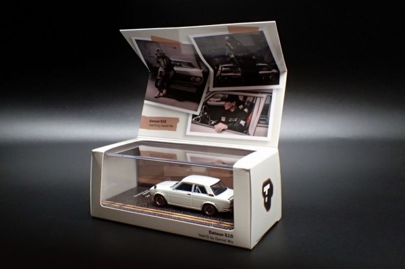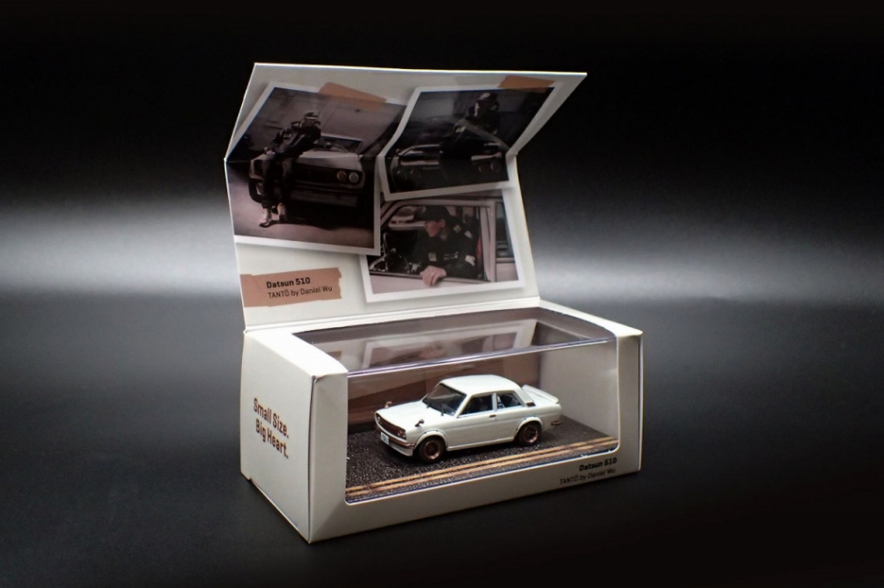 香港の俳優で映画監督のダニエル・ウー氏の愛車「510 Tanto」を1/64スケールダイキャスト素材でモデル化。実車は「DATSUN 510 2ドアセダン」をベースにしたカスタム車両です。フロントエプロン、前後ビス止めオーバーフェンダー、リヤスポイラー