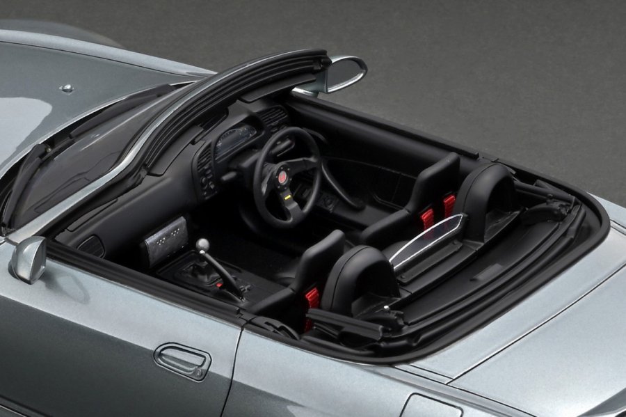 ホンダS2000 (AP2) 後期型を1/18スケールレジンモデルで再現。BBS RG-Rタイプ17インチホイール(シルバー)にローダウン仕様。純正フロントリップ、リヤスポイラー、大径2本出しマフラー(チタン焼けカラー)、大型ブレーキキャリパー、レカロシート、MOMO製ステアリングを装着。幌はマグネットで脱着可能なパーツを2種類準備。オープン&クローズの2つの仕様をお楽しみいただけます。