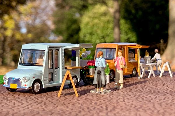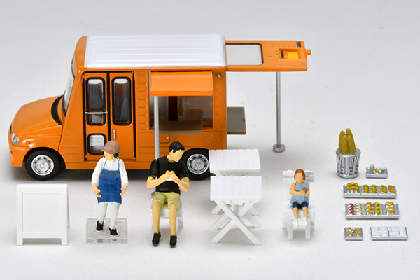 フィギュア・小物を活用して、親子がパンを食べているシーンや、店員さんがお客さんにパンを運ぶシーンを楽しめます。多様なパンのプレートを車内の棚に並べることも可能です。「#カースナップ17a 花屋」(別売・発売中)と組み合わせてマルシェをイメージしたり、同月発売予定のミラ ウォークスルーバンとの相性も抜群です。