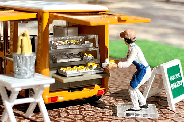 最近、SNSでにわかに盛り上がっている、ミニカーやトイを使った「映え」写真。単に撮影するだけでなく、フィギュアや情景アイテムと組み合わせるなど、いろいろな工夫を楽しむ人たちが増えています。そこでトミーテックが提案するのが、1/64スケールのジオコレ64 #カースナップです。今回は「パン屋」をテーマとした車両とフィギュア・小物のセットです。ダイハツ ミラ ウォークスルーバン(移動販売車)が専用で付属します。