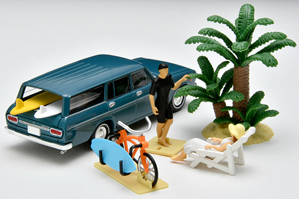 「サーフィン」をテーマにしたフィギュア・小物のセット。サーファーのフィギュア、3種のサーフボード、ビーチクルーザー、ソテツなどが付属します。ミニカーの荷室にサーフボードを置くことが可能です。立ち姿のフィギュアやビーチクルーザーには、立たせるのに便利な台座がそれぞれ付属するのでお手軽にお楽しみ頂けます。