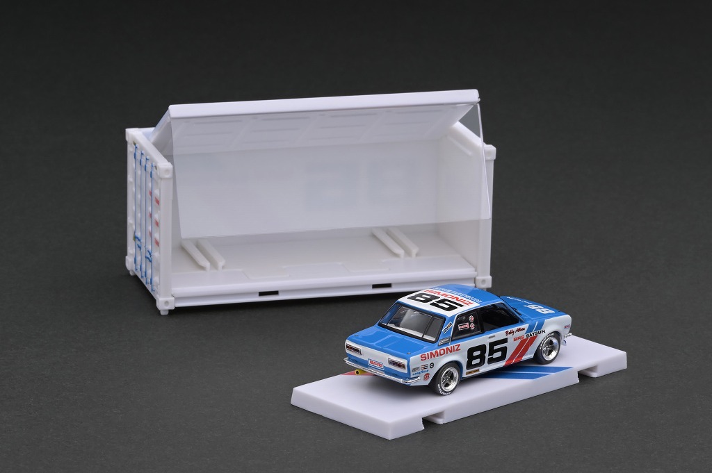 1972年のSCCA トランザムチャンピオンシップシリーズに出場した「BRE Datsun 510 #85 」を1/64スケールダイキャスト素材でモデル化。ドライバーはB.アリソン。フロントスポイラー、前後バンパー、ライト類、ワイパーは別パーツとし、ボディのマーク類はタンポ印刷とデカールで再現しました。専用ステッカー付属。パッケージはコンテナタイプのディスプレイケースになります。