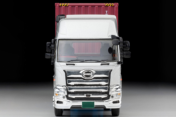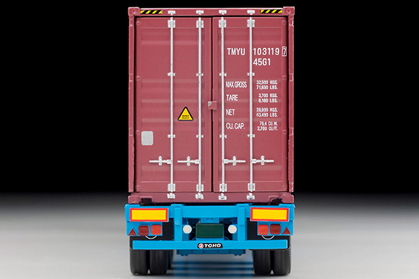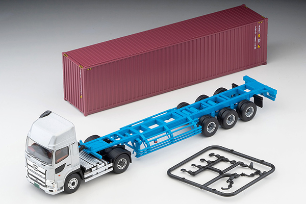 トラクタヘッドに加えて、トレーラー側は後方扉が開閉できる40ftコンテナと、コンテナシャーシ(東邦車輛TC36H1C34)を再現。コンテナとコンテナシャーシはダイキャスト製で、重量感溢れる仕上がりです。2023年10月発売予定の「LV-N298a 日野プロフィア トラクタヘッド(緑)」と組み合わせても楽しめます。