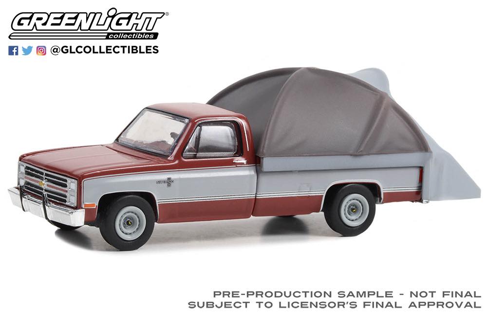 C. 1983 Chevrolet C20 Silverado - Carmine Red and Silver Metallic with Modern Truck Bed Tent