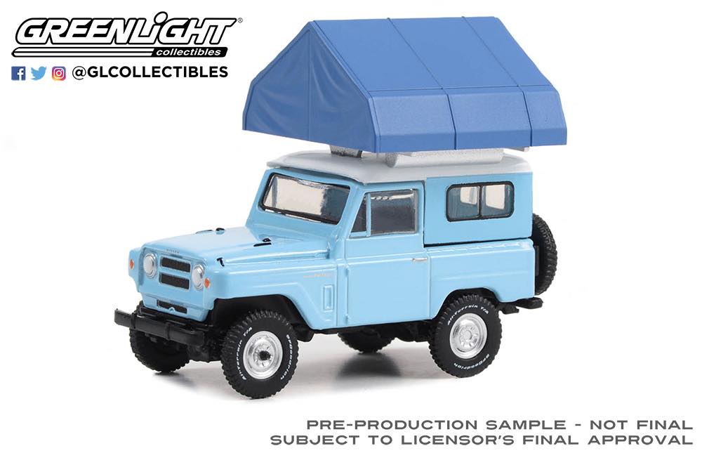 A. 1969 Nissan Patrol (60) - Light Blue & White with Camp'otel Cartop Sleeper Tent