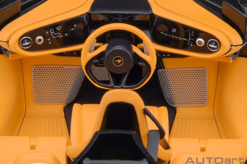 その名のとおり独創的なロングテールデザインを持つ「マクラーレン スピードテール」は、マクラーレンが初めて「Hyper-GT」と謳う究極のロードカーです。最大出力1070psのハイブリッド・パワートレインを搭載し、最高速度403km/h、0-300km/h加速わずか12.8秒という圧倒的パフォーマンスを発揮します。オートアートでは、徹底的な空力性能の追求から生まれた芸術的で滑らかなエクステリアを、最新のデジタル技術を駆使して正確にモデル化しました。1990年代の名車「マクラーレン F1」と同様の3シーターレイアウトや、ボディサイドの気流を整える固定式フロントホイールカバーも忠実に再現。マクラーレン伝統のディヘドラルドアやそこから現れるデジタルミラー、リアウイングの代わりにパネルが湾曲して立ち上がる「エルロン」も可動します。前後のトランクにぴったり収まる専用のバッグも付属します。