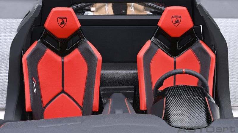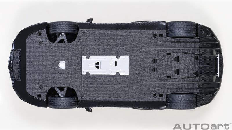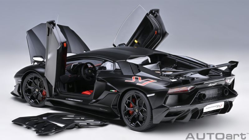 2018年当時、ニュルブルクリンク北コースの市販車最速タイムを記録した『ランボルギーニ アヴェンタドール SVJ』は、最高出力770psに強化された6.5リッターV12エンジンを搭載し、先進の可変空力デバイス「アクティブエアロダイナミクスシステム」と車両統合制御システムを採用するハイパフォーマンスモデルです。オートアートでは、新デザインのフロントスプリッターや大型リアウイング、大型リアディフューザー、リアバンパーの上から突き出したエキゾーストシステムや大型サイドエアインテーク、脱着可能なカーボンファイバー製エンジンフードなど細部までリアルに再現しました。