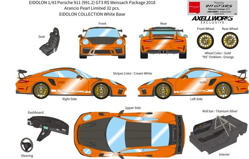 EIDOLON 1/43 Porsche 911 (991.2) GT3 RS Weissach package 2018 Arancio Pearl Limited 32 pcs.