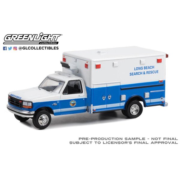 GREEN LiGHT EXCLUSIVE 1/64 First Responders 1993 Ford F-350 Ambulance Long Beach Search & Rescue, Long Beach, California [67062]