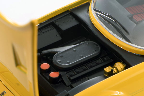 今回は後期型を製品化。365 GTB4と同様、ボンネットを開閉式としました。リアデッキ付近、ボンネット端部のエッジなど、細やかな造形にもご注目ください。今回のボディ色は鮮やかな黄色とし、赤いアクセントが入る黒内装を組み合わせました。