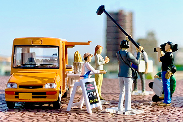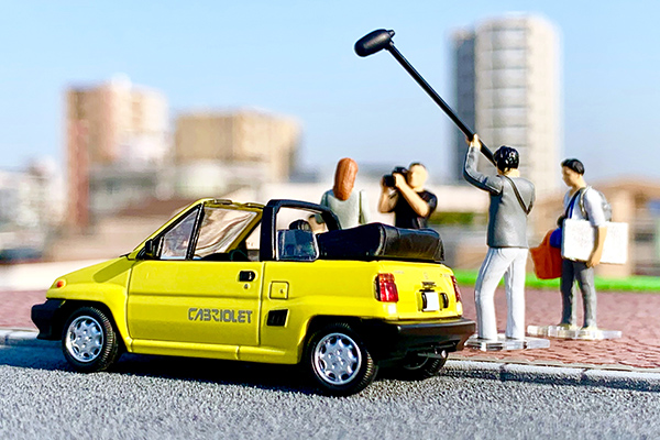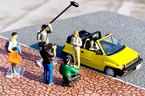 最近、SNSでにわかに盛り上がっている、ミニカーやトイを使った「映え」写真。単に撮影するだけでなく、フィギュアや情景アイテムと組み合わせるなど、いろいろな工夫を楽しむ人たちが増えています。そこでトミーテックが提案するのが、1/64スケールのジオコレ64 #カースナップです。今回は「テレビクルー」をテーマとしたフィギュア・小物のセットです。トミカリミテッド ヴィンテージNEOのホンダ シティ カブリオレが専用カラーで付属します。ボディカラーはイエローとしました。