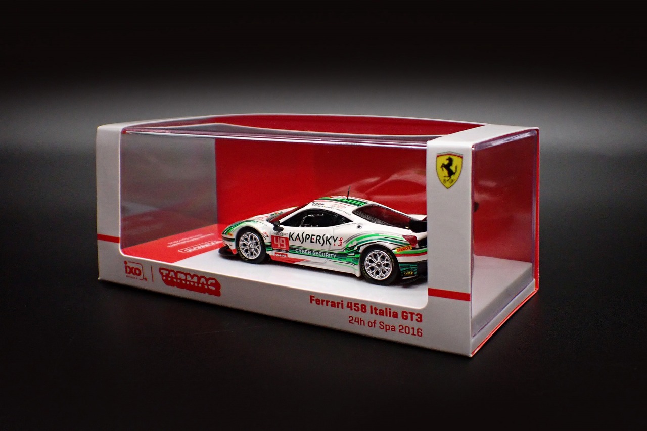 2016年にベルギーのスパ24時間レースに出場し優勝した「Ferrari 458 Italia GT3 #49」を1/64スケールダイキャスト素材でモデル化。フロントスポイラー、ライト類、ミラー、アンテナ、リヤウィングは別パーツとし、複雑なボディのマーク類はタンポ印刷とデカールで再現しました。ディスプレイケース付き。