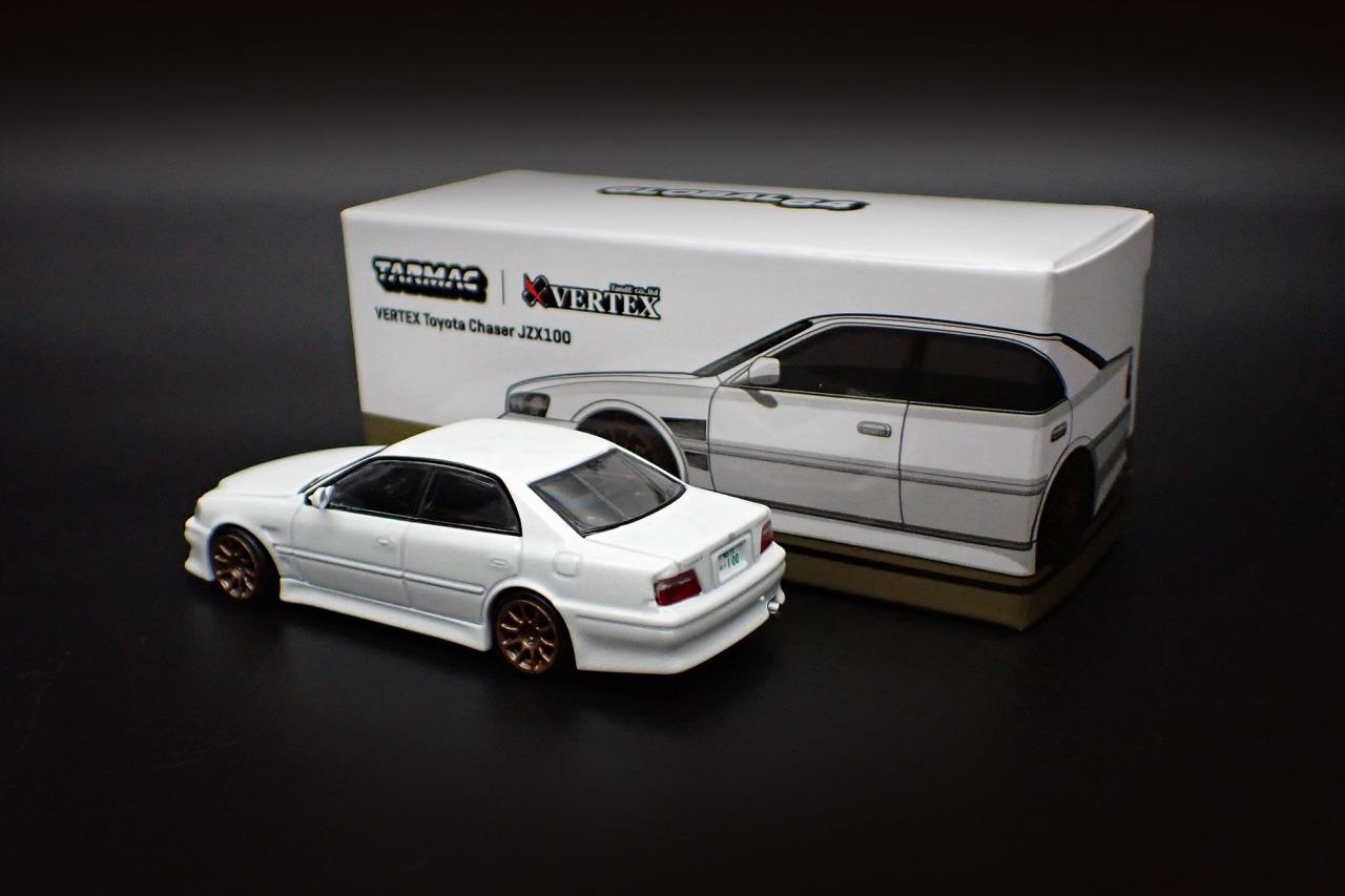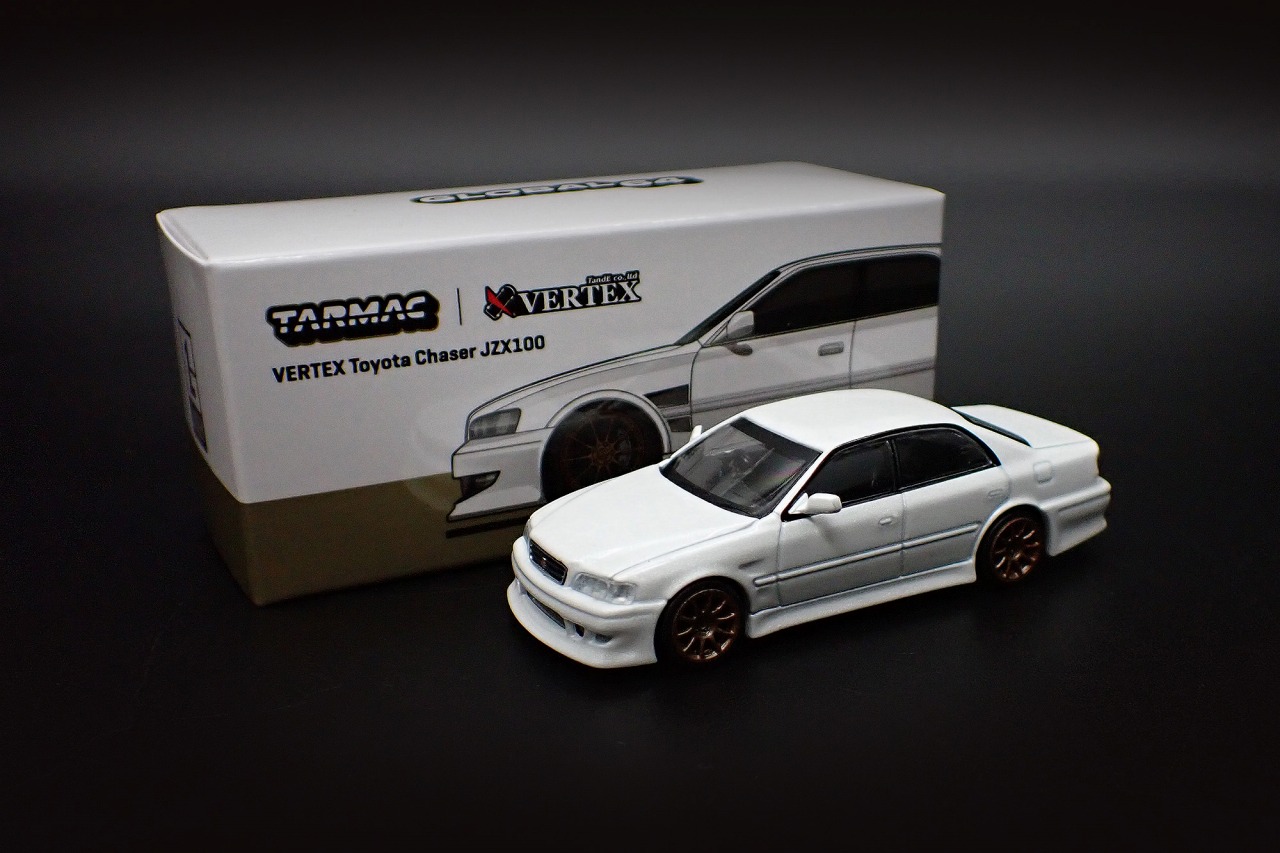 「VERTEX Chaser JZX100」を1/64スケールダイキャスト素材でモデル化。迫力のあるVERTEX製フルエアロパーツに、ライト類、ミラーは別パーツとし、マーク類はタンポ印刷とデカールで再現しました。パッケージは紙箱タイプです。