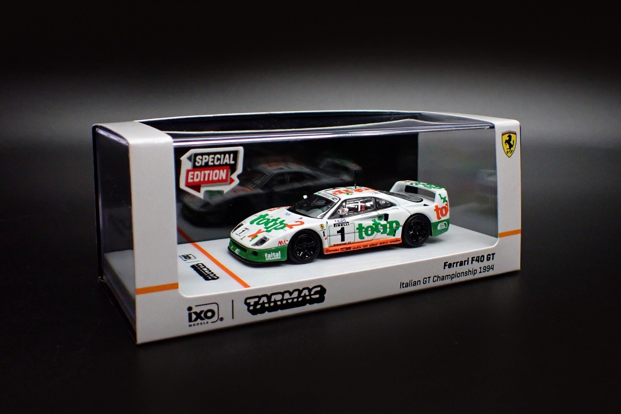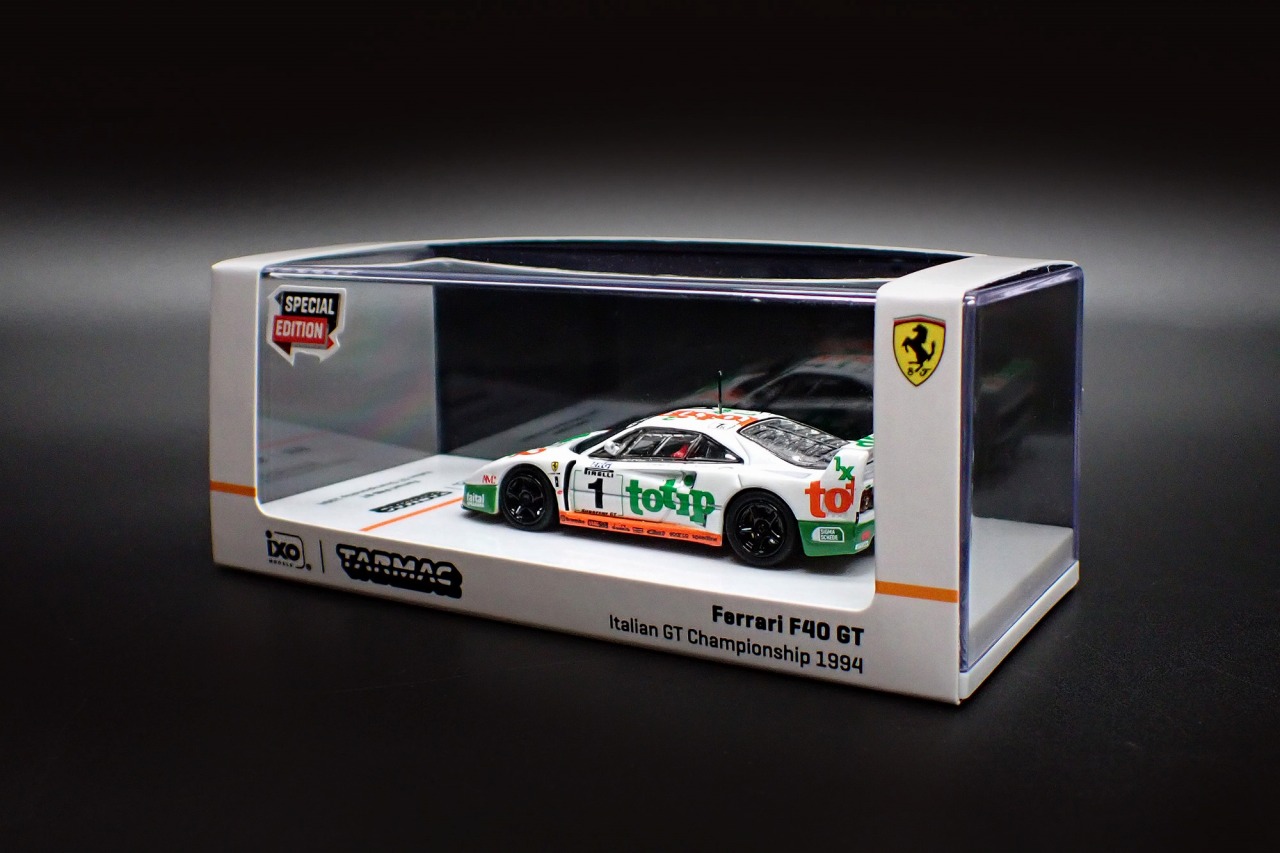 1994年のイタリアンGTチャンピオンシップに出場した「Ferrari F40 GT #2」を1/64スケールダイキャスト素材でモデル化。フロントスポイラー、ライト類、ミラー、リヤウィングは別パーツとし、ボディのマーク類はタンポ印刷とデカールで再現しました。ディスプレイケース付き。