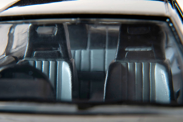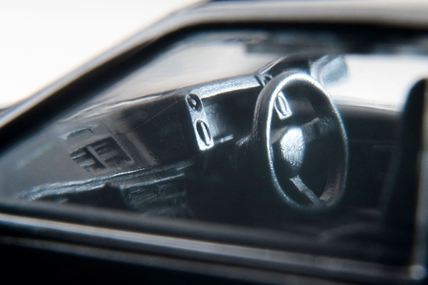 1985年のマイナーチェンジ以降の後期型は、フロントグリルやバンパー、テールランプの変更がメインですが、オプションのスポーツパッケージを選択するとリアスポイラー、サイドマッドガードなどが装着され、見た目にも大きくイメージが変わります。今回はAE86型のトップモデルGT-APEXにスポーツパッケージを装着した状態を2色展開。後期型だけに設定された黒/グレーのボディカラーにも注目ください。