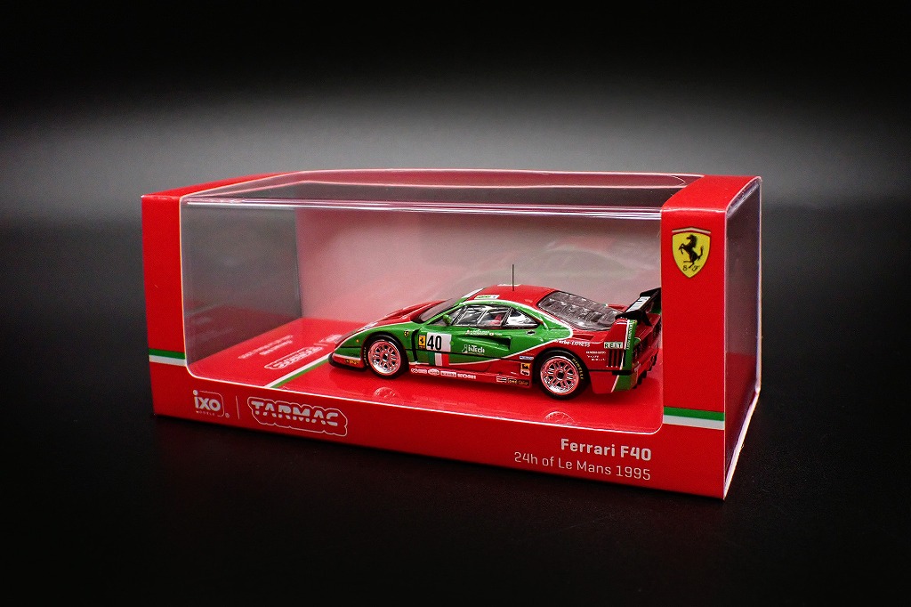 1995年のル・マン24時間耐久レースに出場した「Ferrari F40 LM #40」を1/64スケールダイキャスト素材でモデル化。フロントスポイラー、ライト類、ミラー、アンテナ、リヤウィングは別パーツとし、ボディのマーク類はタンポ印刷とデカールで再現しました。専用ディスプレイケース付き。