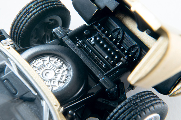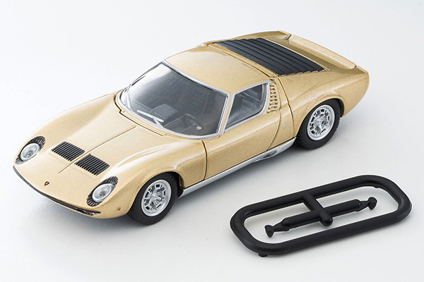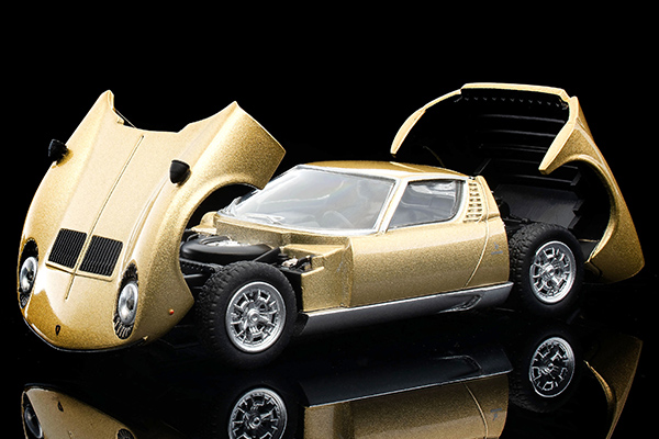 TLVではミウラの主な世代、P400およびS、SVを製品化していますが、今回はミウラSの新色が登場。フロントカウルとリアカウルが開閉し、V型12気筒エンジンやフレームなどの構造を見ることができます。今回はゴールドのボディカラーをチョイスしました。