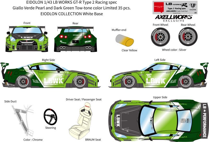 EIDOLON 1/43 LB WORKS GT-R Type 2 Racing spec Giallo Verde Pearl and Dark Green Tow-tone color Limited 35 pcs.