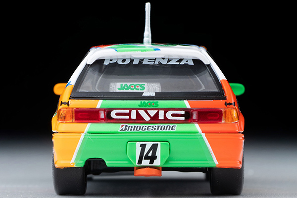 『グランドシビック』と呼ばれたEF系ホンダ・シビックは、グループA規格で争われた全日本ツーリングカー選手権(JTC)ディビジョン3に1988年から参戦。1990年からはマイナーチェンジ後のEF9型にベース車を変更、新技術VTECエンジンを採用し、さらに実力を向上させました。今回は、JACCSシビックの、EF9型での参戦最終年度となる1992年仕様を製品化いたします。