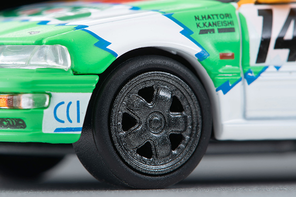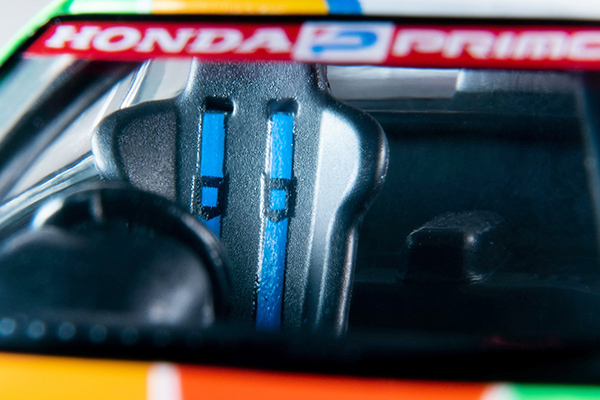 ホイール、大型スポイラー等の外装はもちろん、ロールケージを入れた内装などにご注目ください。また、ボディの複雑なカラーリングも極力タンポ印刷にて再現。加熱する一方だった当時のJTCディビジョン3の熱気が机上によみがえります。