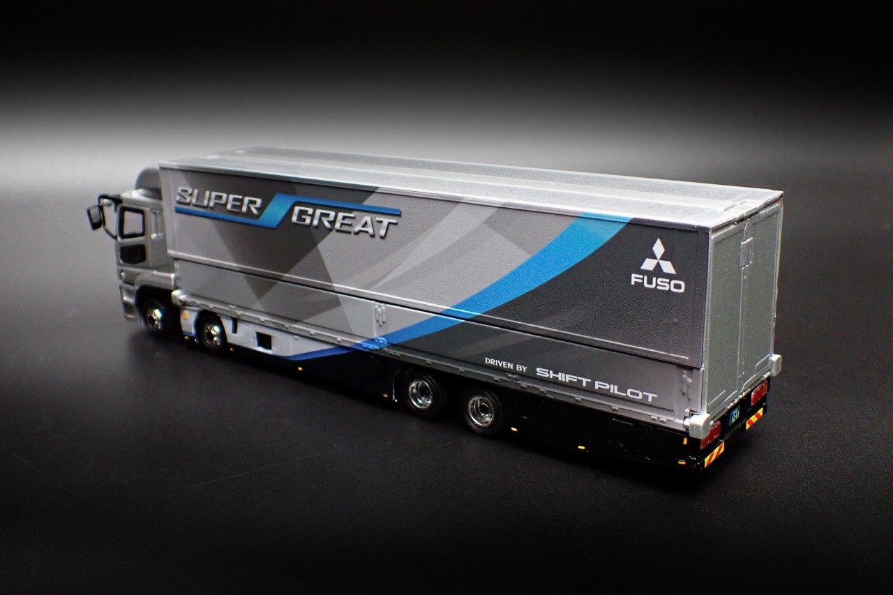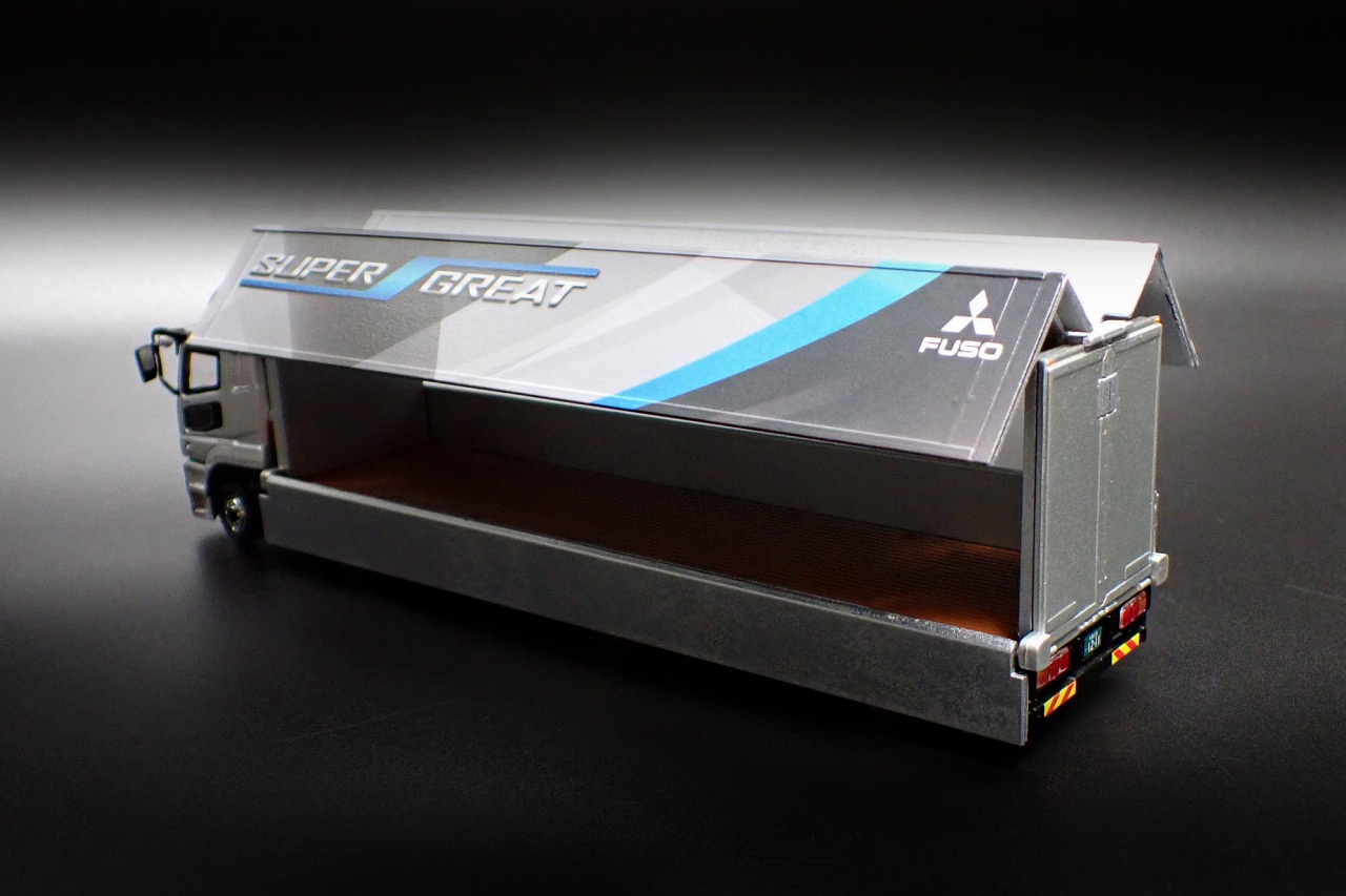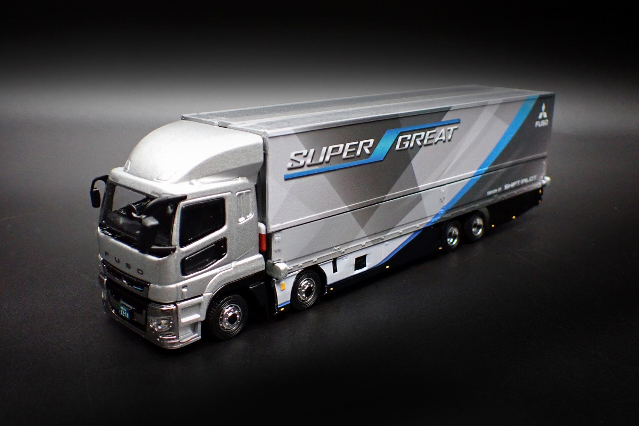 メーカーのプロモーション用にデザインされたウィングボディ部とエアロパーツが特徴的な「三菱Fuso Super Great」トラックを1/64スケールダイキャスト素材でモデル化。左右ウィングパネルの開閉、キャビンの可倒、エンジン再現等のギミック付です。エアロパーツ(バンパースポイラー、エアディフレクター、サイドスカート)、ライト類、ミラーは別パーツとし、マーク類はタンポ印刷とデカールで再現しました。パッケージは紙箱タイプです。
