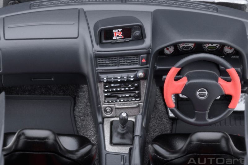 ニスモ創立20周年記念モデル『ニスモ R34 GT-R Z-tune』は、R34型スカイラインGT-Rをベースに、熟練工のハンドメイドによるレース車両同様の工程で製作され2004年から販売されました。500ps以上を発揮する2.8リッター「RB26DETT改Z2」エンジンを搭載し当時脚光を浴びたマニア垂涎のスペシャルコンプリートカーです。オートアートでは、実車を3Dスキャニングし、シャープなボディ形状を可能な限り正確にモデル化。迫力のスタイルを構成するCFRP製フロントバンパー、フロントフェンダー、アウトレット付きボンネットをはじめ、アルミ製大型ラジエターやRAYS製軽量鍛造アルミホイールなど細部まで余すところ無くリアルに再現しました。