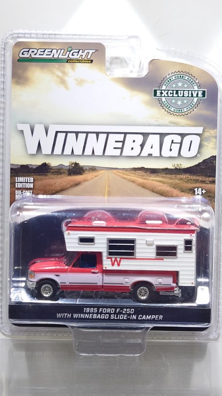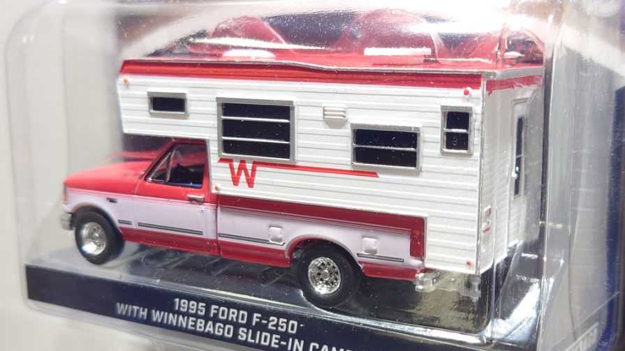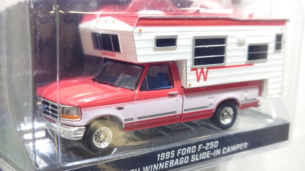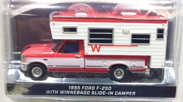 GREEN LiGHT EXCLUSIVE 1/64 1995 Ford F-250 Long Bed with Winnebago Slide-In Camper - Bright Red and Oxford White [30449]