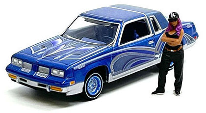 JOHNNY LIGHTNING 1/64 1984 Oldsmobile Cutlass Lowrider Blue with Lowrider Enthusiast Figure