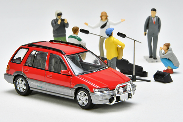 「路上ライブ」をテーマにしたセット。ギターを演奏する2人、踊る人、撮影する人、通りすがりの人等や、情景パーツ各種で路上ライブのシーンを展開できます。ミュージシャンが乗ってきたホンダ シビックシャトル ビーグル(専用仕様)も付属。「#カースナップ21a カフェテラス 」(別売・2023年10月発売予定)と組み合わせればより一層、ストリートの雰囲気がお楽しみいただけます。クルマとその周辺が映える写真をSNSに投稿して、#カースナップや#TLVを盛り上げましょう。