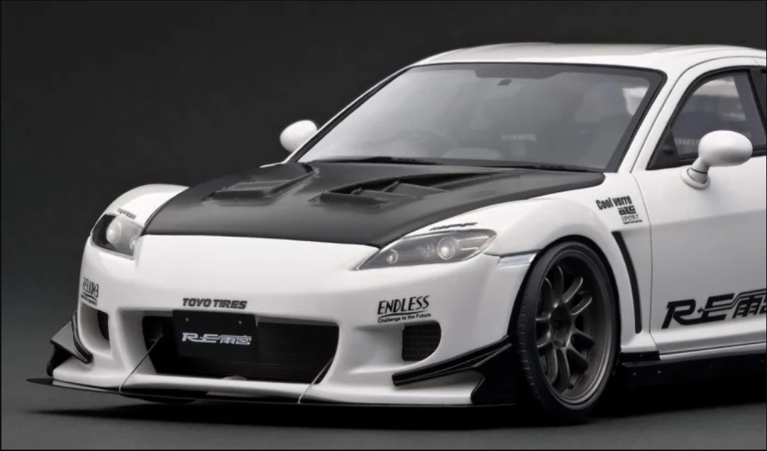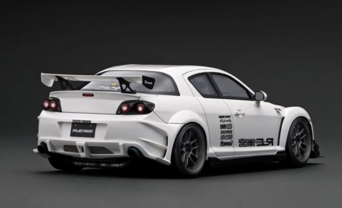 「マツダRX-8 (SE3P) 」をベースにしたRE雨宮のカスタム仕様を1/18スケールレジン素材でモデル化。ENKEI PF01エボタイプ18インチホイール(ガンメタリック)にローダウン仕様。RE雨宮製エアロパーツ(フロントバンパー、カナード、サイドスカート、リヤバンパー)、カーボンボンネット、GTウィング、ボディ各所にスポンサーマーク、バケットシート装着。