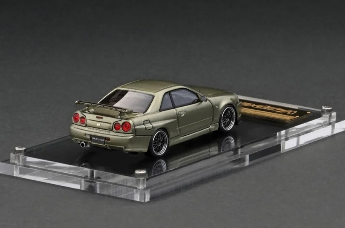 スカイラインGT-R(R34) V-spec IIをベースにしたライトカスタム仕様を1/64スケールレジンモデルで再現。BBS LM タイプ18インチホイール(ポリッシュ&ガンメタリック)にローダウン仕様。純正エアロパーツに大径マフラーを装着。アクリル製のディスプレイ台座にゴールドのアルミプレートが上位モデルに相応しい高級感を演出しました。