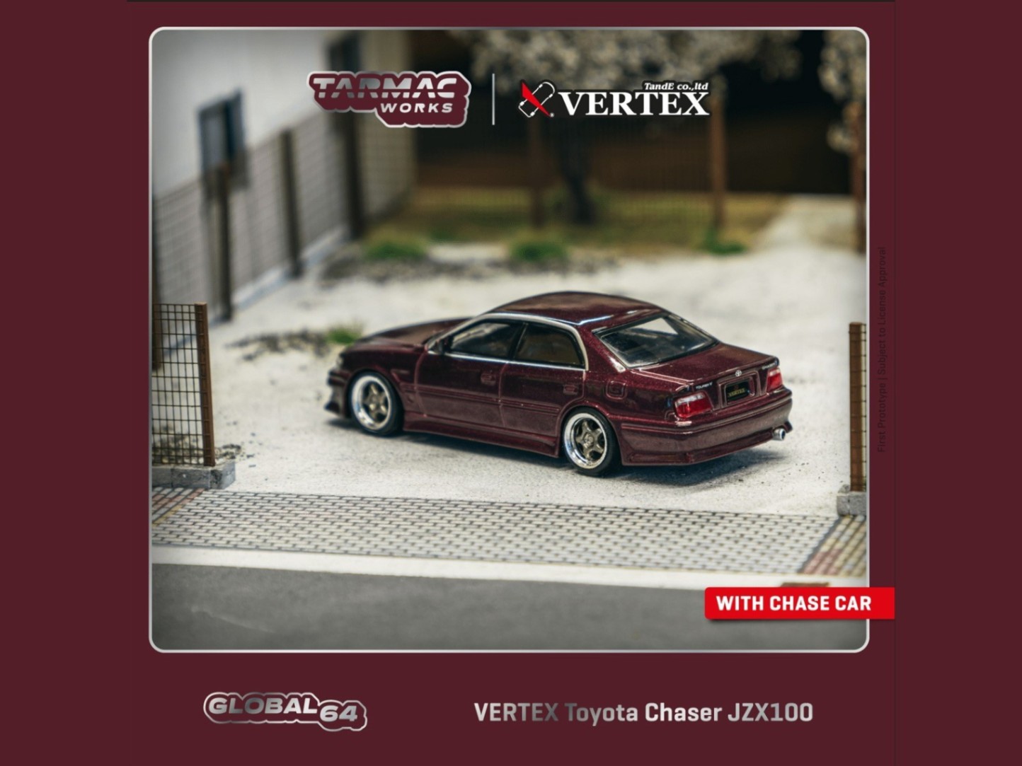 「VERTEX Chaser JZX100」を1/64スケールダイキャスト素材でモデル化。迫力のあるVERTEX製フルエアロパーツに、ライト類、ミラーは別パーツとし、マーク類はタンポ印刷とデカールで再現しました。パッケージは紙箱タイプです。
