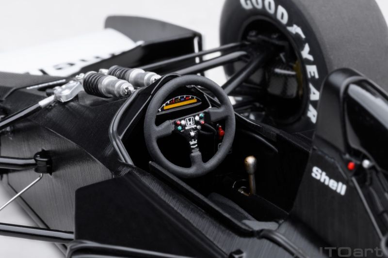 『マクラーレン ホンダ MP4/6』は、名門F1チーム「マクラーレン」が史上初めてカーボン製モノコックを採用したMP4シリーズの最新シャシーに、新型V12エンジン「ホンダ RA121E」を搭載。フロントサスペンションや空力パーツの改良などで戦闘力をアップさせ1991年シーズンに登場しました。鈴鹿サーキットで開催された第15戦日本GPではベルガーが優勝。セナは2位に入り自身3度目のドライバーズタイトルを確定させ、4年連続ドライバーズ&コンストラクターズのダブルタイトルを獲得しました。オートアートでは、日本でのF1ブーム真っ只中のチャンピオンマシンを入念な取材によってリアルに再現。カウルを外して鑑賞できる圧巻の再現度を誇るエンジン回りやサスペンションなど見どころ満載です。1号車と2号車のロゴの有無の違いで計4アイテムをモデル化しました。