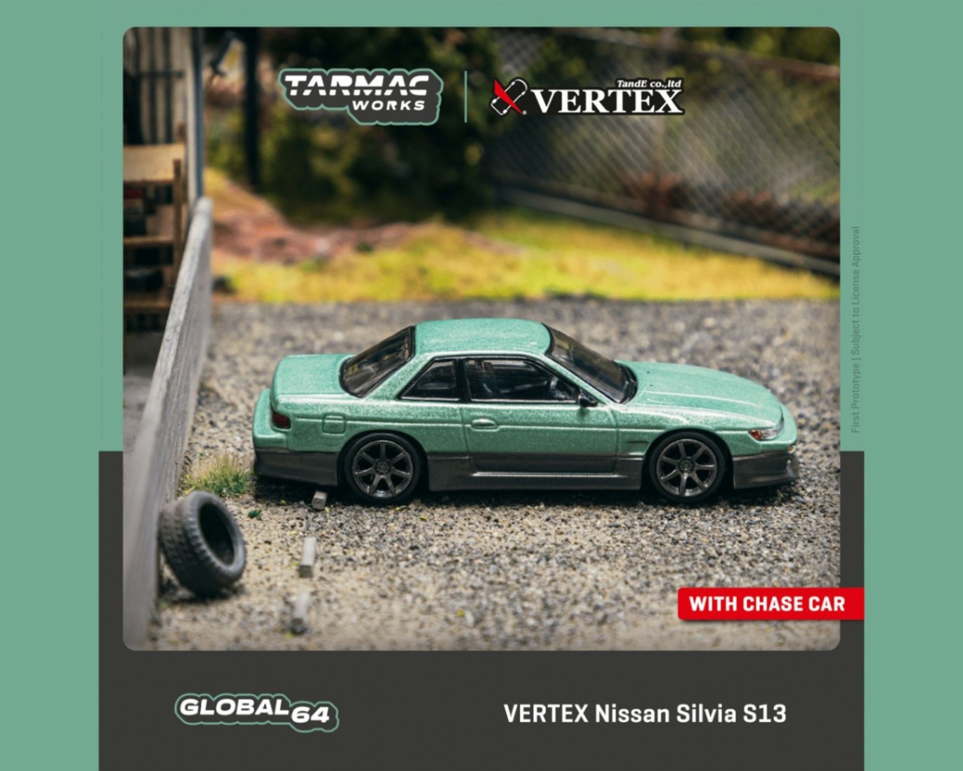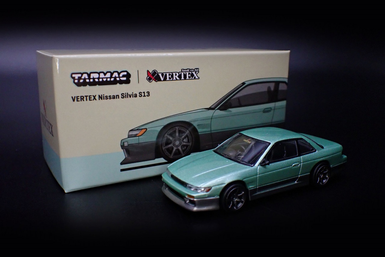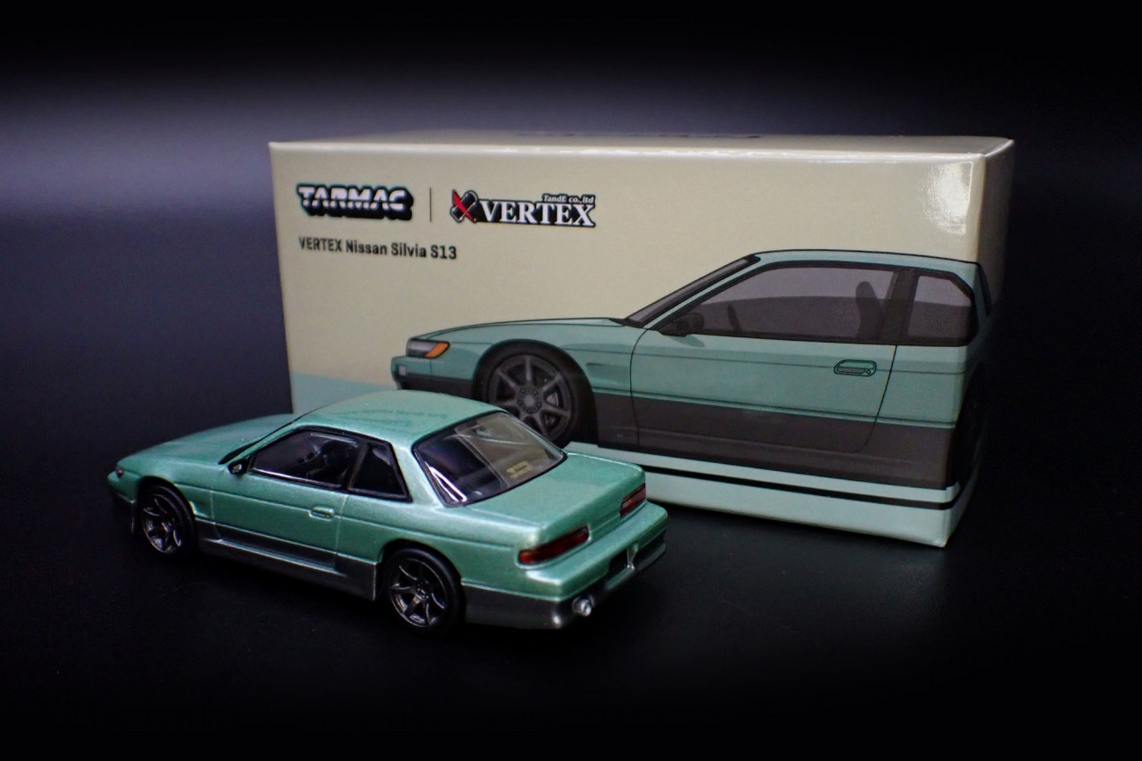 「VERTEX Silvia S13」を1/64スケールダイキャスト素材でモデル化。VERTEX製フルエアロパーツに、ライト類、ミラーは別パーツとし、マーク類はタンポ印刷とデカールで再現しました。パッケージは紙箱タイプです。
