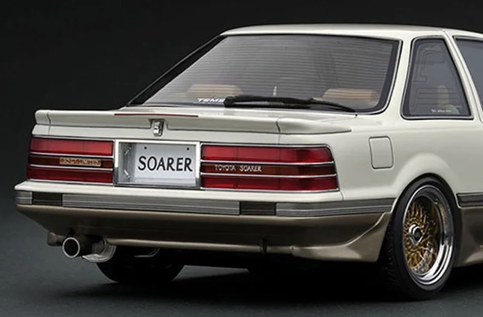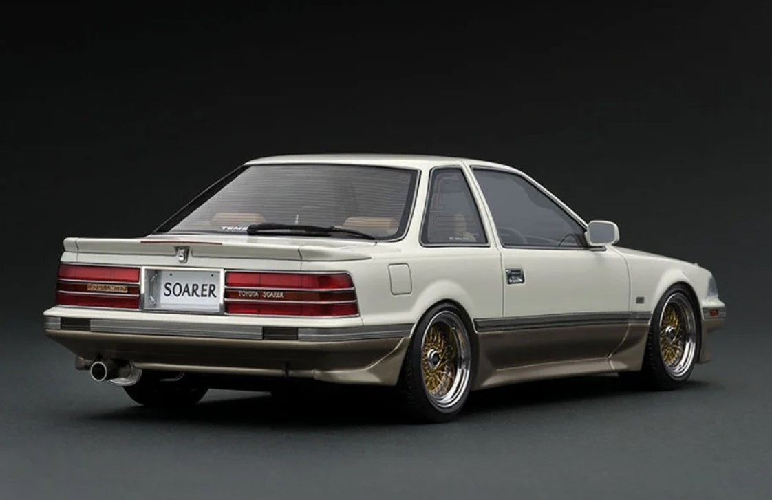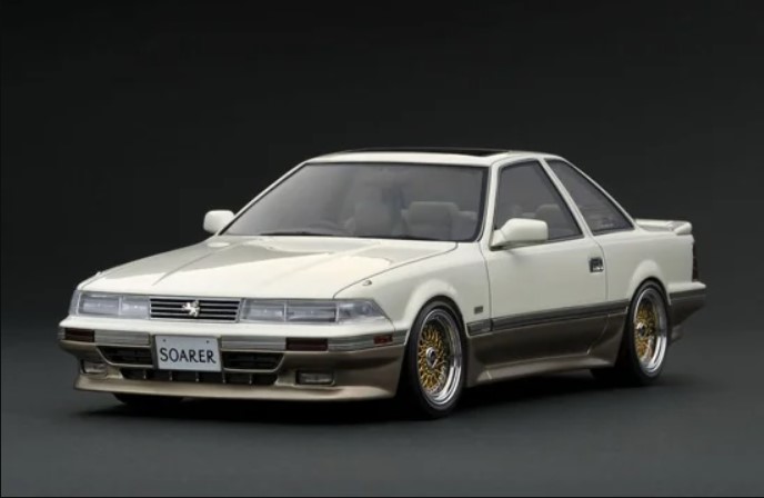 「ソアラ(Z20)3.0GT-LIMITED」をベースにしたライトカスタム仕様を1/18スケールレジンモデルで再現。ボディカラー:パールホワイト/シャンパンゴールド。BBS RSタイプ17インチホイール(ポリッシュ&ゴールド)にローダウン仕様。純正エアロパーツ(フロントリップスポイラー、サイドステップ、リヤスポイラー、エアロマットガード)、サンルーフ、大径シングルマフラー、内装色はベージュ系、純正シート、純正ステアリングを装着。